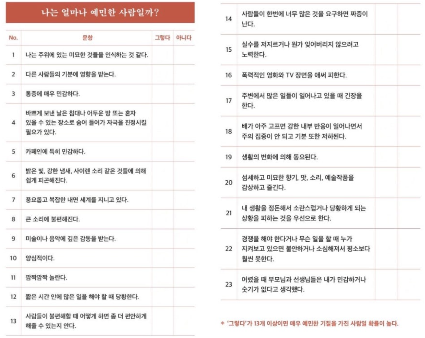 시도의 결과는 나쁘지 않았던 것 같다. 어느 순간부터 주변 사람들이 내 성격을 묘사할 때 무던하다, 안정적이다, 덤덤하다 같은 단어를 사용하기 시작했다. 스스로 느끼기에도 많이 편안해졌다. HSP 자가 테스트 같은 것을 해봐도 평균 이하의 결과가 나온다. 어린 내가 했다면 모든 항목에 동그라미를 치면서 눈물을 흘렸을 텐데.